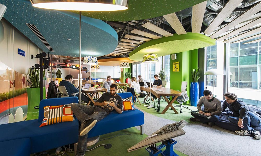 دفاتر کار گوگل معمولا بسیار خلاقانه دیزاین می شوند به گونه ای که پرسنل در این محیط آرامشی فراتر از انتظار دارند و می توانند با خیال آسوده به پیچیدگی های مسائل فنی مرتبط فکر کنندو اغلب راه حل های فنی مناسبی نیز برای این گزینه ها حاصل می شود.