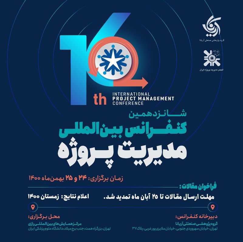 شانزدهمین کنفرانس بین المللی مدیریت پروژه در تاریخ ۲۴ بهمن ۱۴۰۰ توسط ،گروه پژوهشی صنعتی آریانا در شهر تهران برگزار خواهد شد